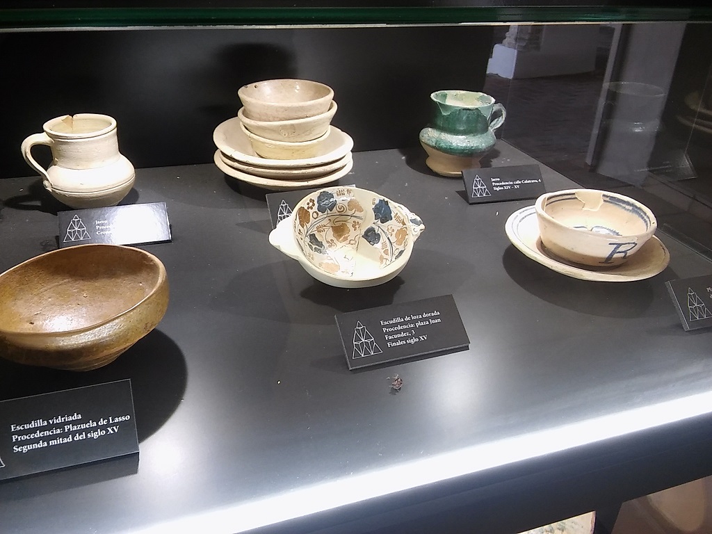 Pero no todo son pinturas murales en el Centro del Mudéjar. Como su nombre indica, es un espacio expositivo donde se cuenta la forma de vida de los habitantes de Carmona en el cambio de la Edad Media a la Edad Moderna, cuando la fe islámica fue sustituida por la cristiana. Fueron muchas las costumbres y hábitos que perduraron en la ciudadanía a pesar de abrazar una nueva religión. El Centro se ha instalado, a la espera de seguir con las obras de recuperación de la casa, en una de las estancias laterales del patio, con una cubierta de madera a dos aguas. Una serie de vitrinas y paneles explican, de manera temática, diferentes aspectos de la vida cotidiana a finales del siglo XV y principios del XVI: el vestido, el urbanismo, el comercio...